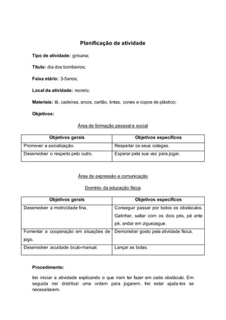 Esta atividade planeada é uma gincana com o tema "Dia dos Bombeiros" para crianças de 3-5 anos no recreio da escola. Os objetivos são promover a socialização, respeito pelo outro e cooperação, desenvolver a motricidade e acuidade manual, e demonstrar gosto por atividade física. A atividade inclui passar por baixo de lã, equilíbrio, andar em arcos e contornar cones e acertar copos.