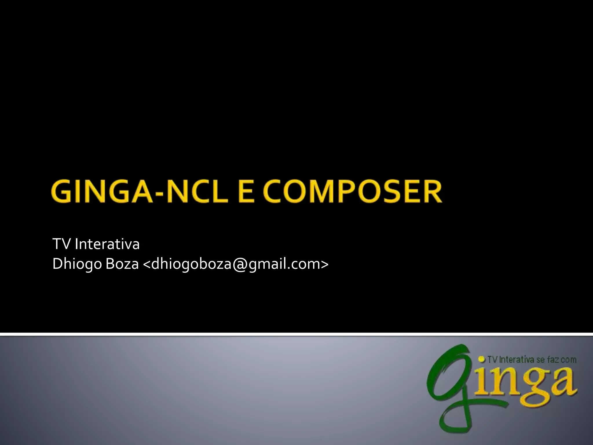 O documento descreve a linguagem NCL e sua ferramenta Composer para criação de aplicações interativas para TV digital. O NCL usa nós, links e descritores para estruturar mídia em tempo e espaço. O Composer permite adicionar mídia, definir regiões e ligar componentes para criar interatividade por meio de portas e conectores.