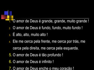 O documento discute a grandeza do amor de Deus, destacando que ele é grande, profundo, alto e envolve todas as direções. Também fala sobre crescer na humildade, união e serviço para a edificação do corpo de Cristo.