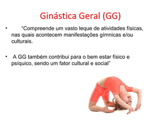 A ginástica geral compreende uma vasta gama de atividades físicas e culturais que promovem o bem-estar físico e psíquico. Ela engloba modalidades competitivas e não competitivas como ginástica artística, ritmica, aeróbica e dança. A ginástica geral objetiva proporcionar lazer e integração social para pessoas de todas as idades.