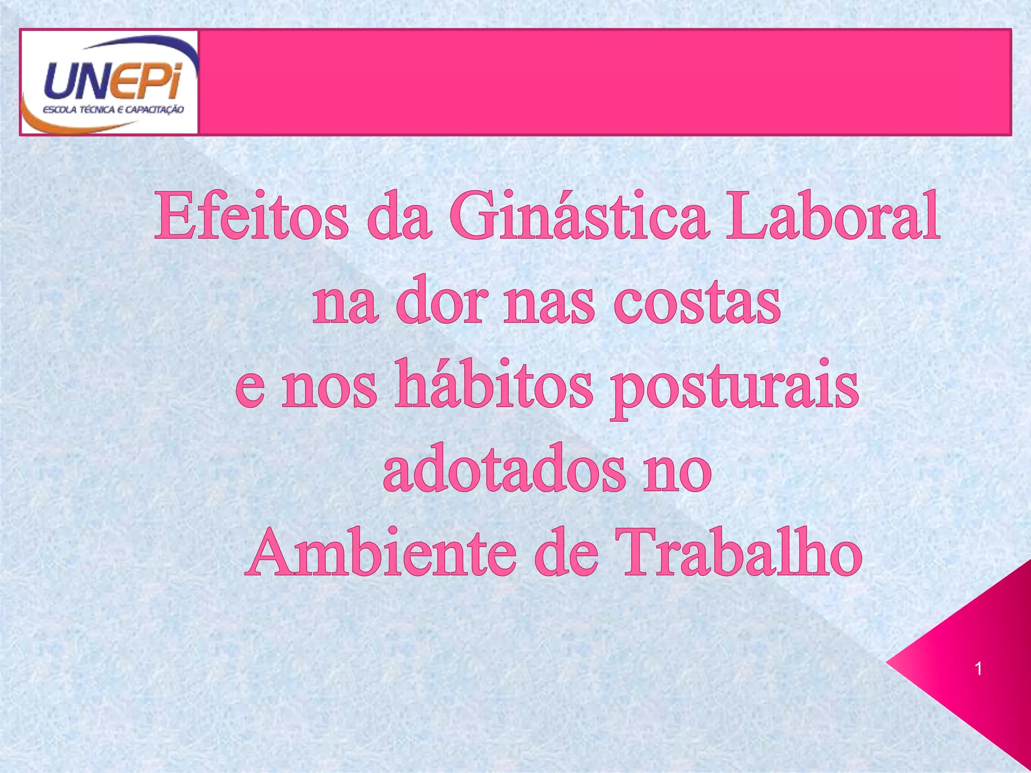 O documento discute os benefícios da ginástica laboral no ambiente de trabalho. A ginástica laboral envolve exercícios de alongamento, resistência e flexibilidade realizados 3 vezes por semana por 30 minutos para compensar posturas e movimentos repetitivos e reduzir estresse e dores musculares. Um estudo mostrou que a ginástica laboral melhorou a qualidade de vida dos trabalhadores e aumentou a produtividade das empresas.