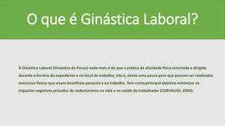 A ginástica laboral envolve a realização breve de exercícios físicos no local de trabalho durante intervalos, com o objetivo de melhorar a saúde e bem-estar dos funcionários. Vendedores precisam de exercícios para membros inferiores e superiores para fortalecer os músculos usados em suas atividades diárias como andar, carregar objetos e subir escadas. Exercícios simples como alongamentos e levantamentos de pernas podem ser feitos em séries curtas durante pausas no trabalho.
