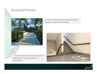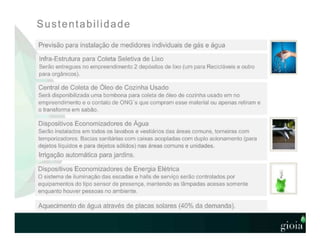 O documento descreve um empreendimento residencial com uma torre de 92 unidades, incluindo apartamentos de diferentes tipos e tamanhos, como padrão, duplex e varanda. As áreas comuns incluem diversas praças, piscinas, quadra recreativa e espaços de lazer com infraestrutura acessível e adaptações para portadores de necessidades especiais. Também detalha aspectos técnicos, como sistema de aquecimento solar, segurança, e opções de personalização para os apartamentos.