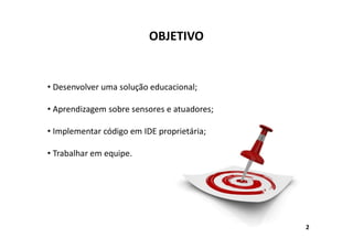 O documento descreve um projeto de um robô chamado Gyro Boy construído com o kit LEGO Mindstorms EV3. O objetivo era desenvolver uma solução educacional para ensinar sobre sensores e atuadores, implementando código em uma IDE proprietária enquanto trabalhando em equipe. O protótipo incluiu um sensor ultrassônico, motores médio e grande, sensor de luminosidade, sensor de toque e um giroscópio conectado a um microcontrolador. O documento explica como o giroscópio funciona com base na primeira lei de Newton