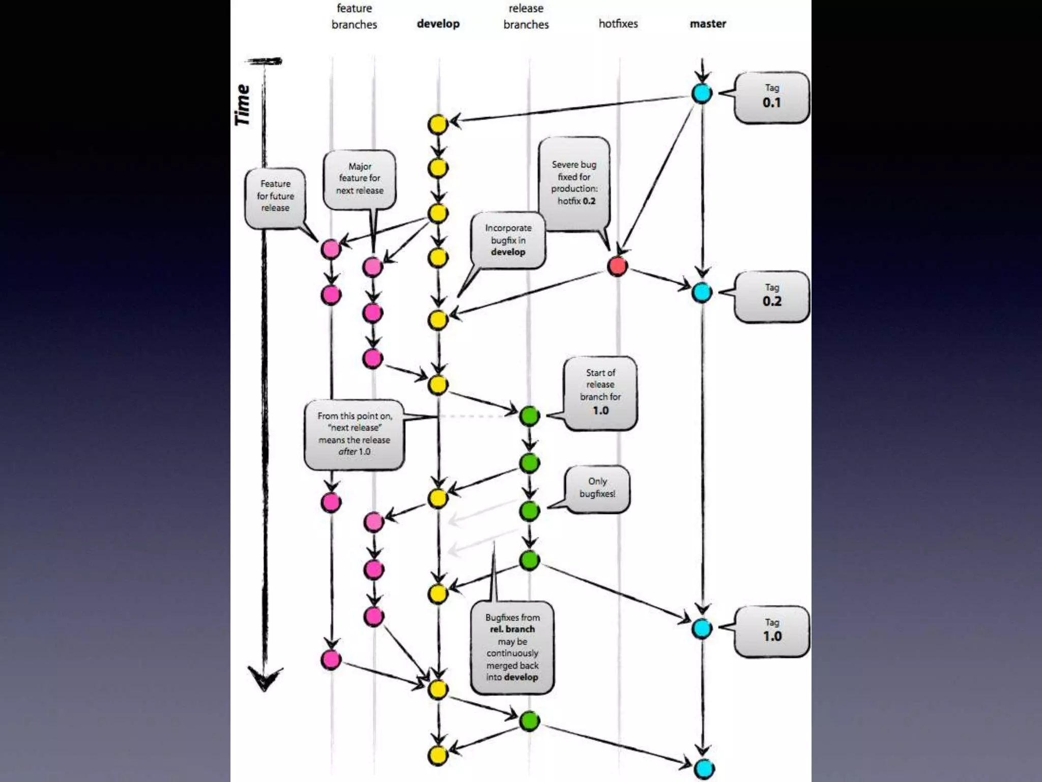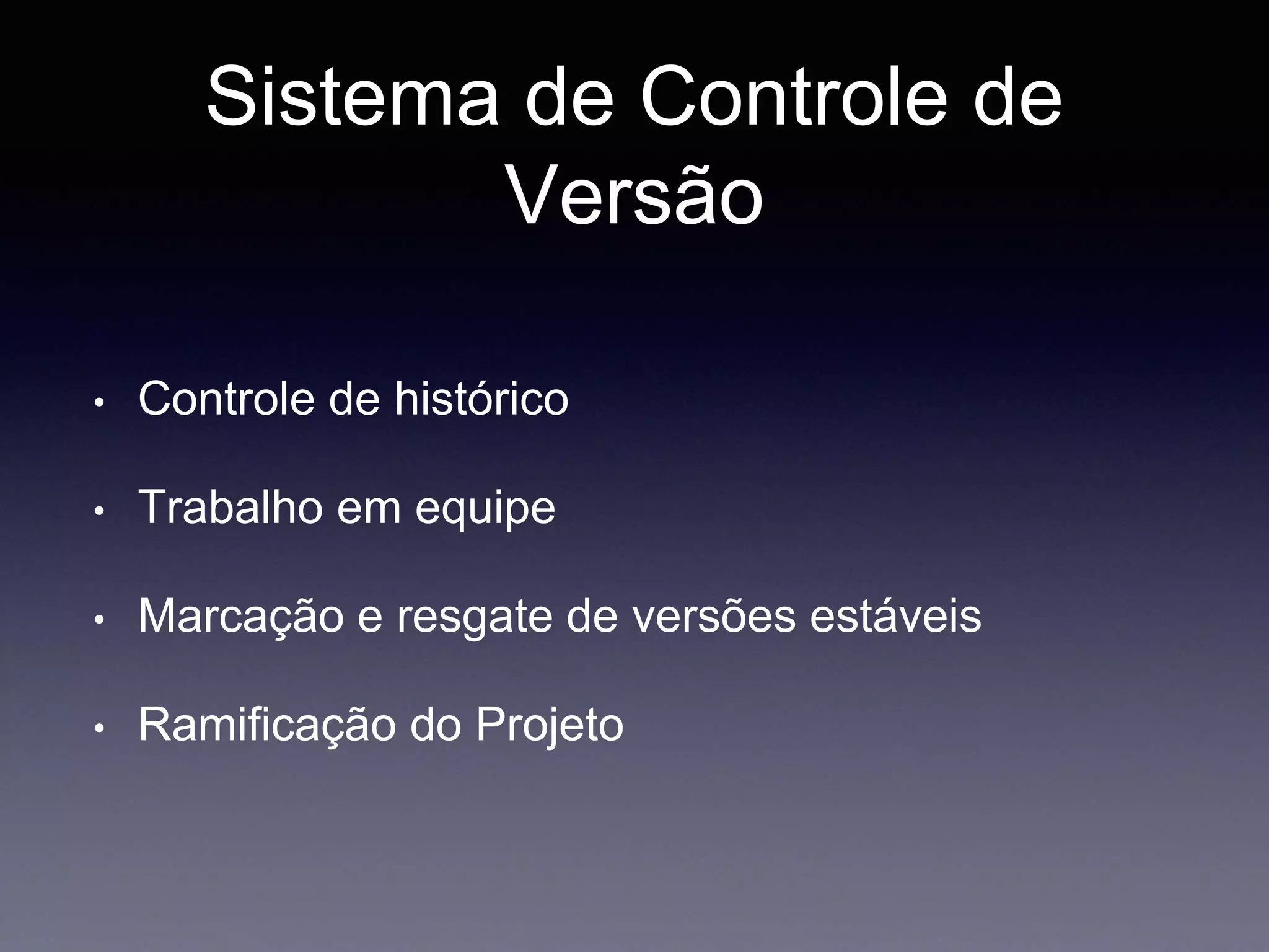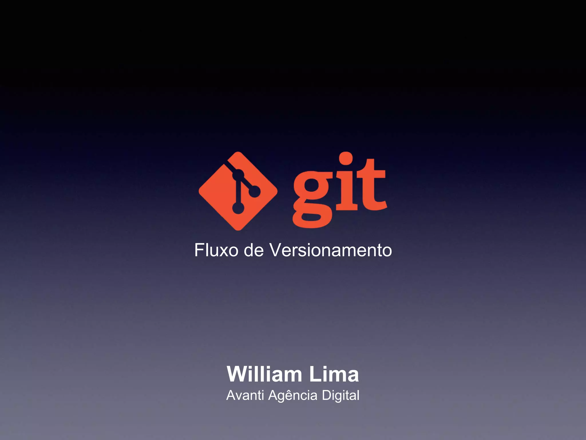 O documento aborda o fluxo de versionamento utilizando o Git, destacando suas principais funcionalidades, como controle de histórico, ramificações e processos de commit. Explica detalhadamente as ramificações principais e auxiliares, como feature, release e hot-fix, apresentando comandos para gerenciar essas operações. Também fornece referências para aprofundamento no uso do Git e suas melhores práticas.
