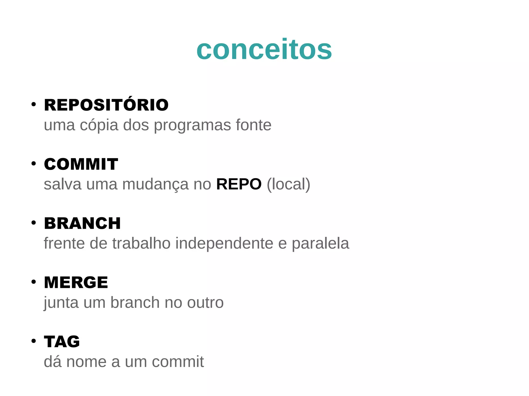 O documento explica os principais conceitos do Git, incluindo repositório (cópia local dos arquivos do projeto), commit (salvar alterações no repositório local), branch (versões paralelas do código), merge (integrar branches), tag (marcar commits importantes) e pull/push (sincronizar repositórios locais e remotos).