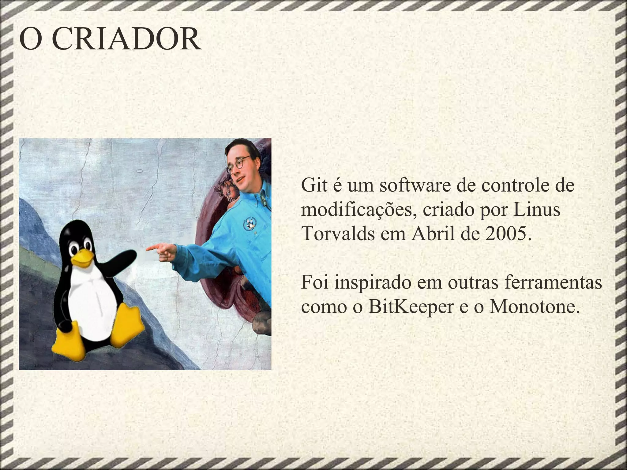 Git é um software de controle de versão criado por Linus Torvalds em 2005 para controlar modificações de forma rápida, fácil e gratuita, inspirando-se em ferramentas como BitKeeper e Monotone.