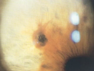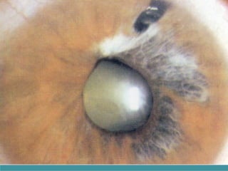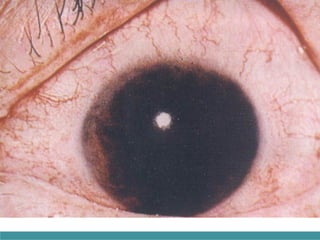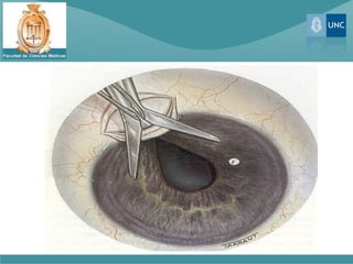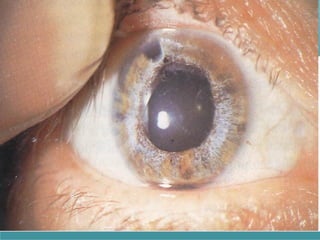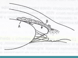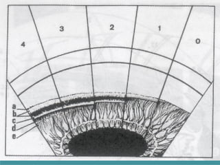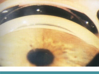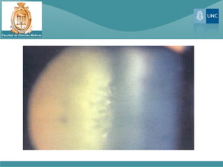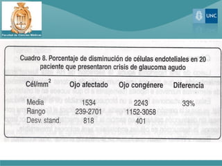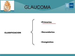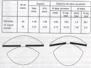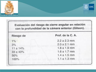 El documento describe el glaucoma de ángulo cerrado primario, incluyendo su definición, factores de riesgo, fisiopatogenia, signos clínicos y tratamiento. Se caracteriza por un cierre mecánico del ángulo iridocorneal que conduce a hipertensión ocular, y su fisiopatogenia involucra factores anatómicos como un eje anteroposterior más corto y un cristalino más grueso e inserto más anteriormente.