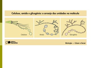 Os carboidratos são classificados em monossacarídeos, dissacarídeos e polissacarídeos dependendo do número de açúcares simples unidos. A glicose é um monossacarídeo importante na fotossíntese e respiração, enquanto a sacarose e o amido são dissacarídeos e polissacarídeos armazenadores de energia.