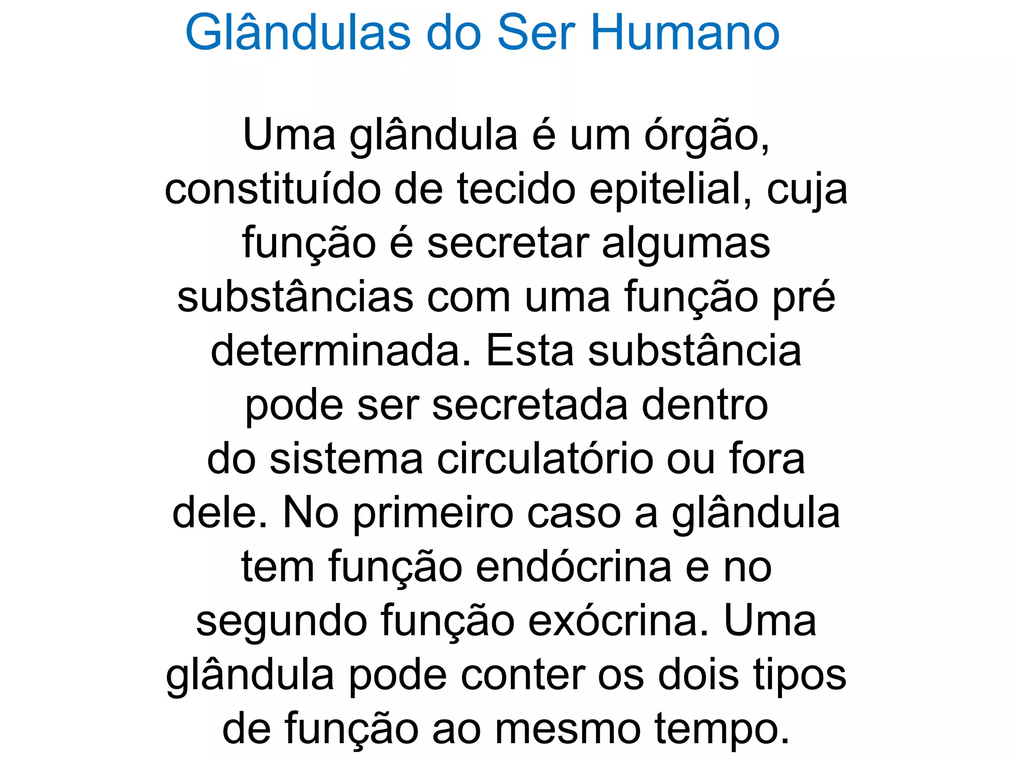 O documento descreve as principais glândulas do corpo humano, dividindo-as em endócrinas e exócrinas. Entre as glândulas endócrinas, destaca-se o pâncreas, hipófise, gônadas e tireóide, responsáveis pela produção de hormônios. Já as glândulas exócrinas incluem as sudoríparas, lacrimais, salivares e mamárias, que secretam substâncias para lubrificação, digestão e amamentação.