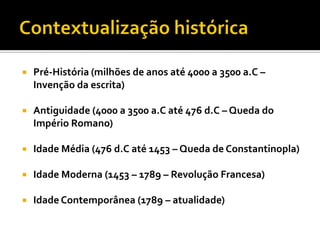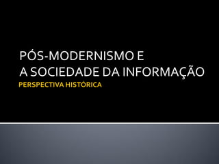 O documento discute a evolução histórica da sociedade desde a Pré-História até a Idade Contemporânea, com ênfase no surgimento do pós-modernismo e da sociedade da informação após a Segunda Guerra Mundial, caracterizada pelo desenvolvimento tecnológico, mudança no paradigma dos meios de comunicação e excesso de informações.