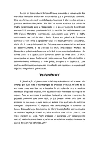 O documento discute a globalização comercial e financeira. A globalização comercial aumentou substancialmente em países como o Reino Unido, França, Alemanha e Estados Unidos desde 1950, embora o Japão tenha mantido níveis semelhantes de comércio exterior. A globalização financeira também cresceu rapidamente desde 1970, com ativos e passivos externos aumentando significativamente. No entanto, a globalização total ainda não foi alcançada.
