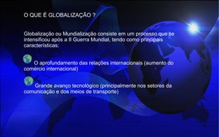 A globalização é um processo intensificado após a II Guerra Mundial, caracterizado pelo aumento das relações internacionais e avanços tecnológicos que facilitam o comércio global. Seus efeitos incluem integração entre países, aumento da desigualdade e desemprego, mas também crescimento econômico e intercâmbio cultural. Contudo, a globalização traz desafios como a contaminação econômica entre países e distorções cambiais, exigindo análises cuidadosas de seus impactos positivos e negativos.