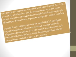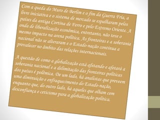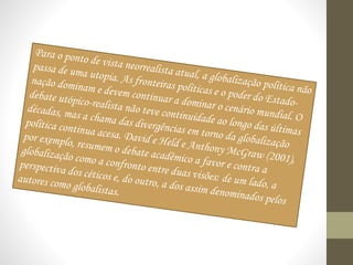 O documento discute visões realistas e idealistas das relações internacionais, com os realistas enfatizando o poder do Estado-nação e os interesses nacionais, em contraste com as visões utópicas idealistas. Também contrasta visões céticas e globalistas da globalização, com os céticos enfatizando a soberania estatal e os globalistas argumentando que a globalização enfraquece os Estados-nação. Por fim, argumenta que, apesar da globalização, os Estados-nação permanecem como atores centrais nas relações internacionais.
