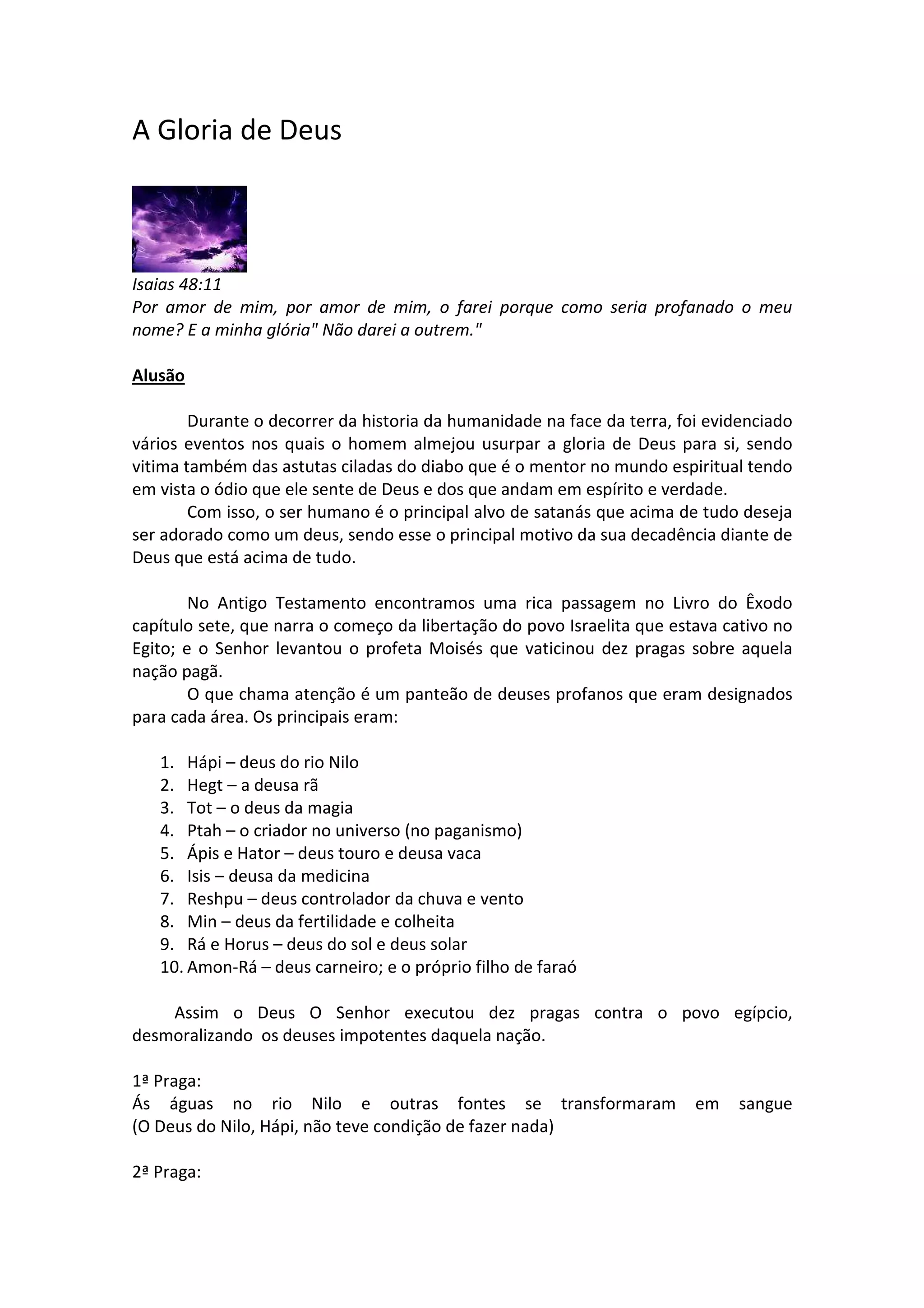 O documento discute como Deus executou dez pragas no Egito antigo para desmoralizar os deuses egípcios e mostrar que Ele é o único verdadeiro Deus. Também alerta que buscar refúgio ou adoração em outros seres que não Deus é pecado, já que só Ele merece toda honra e glória.