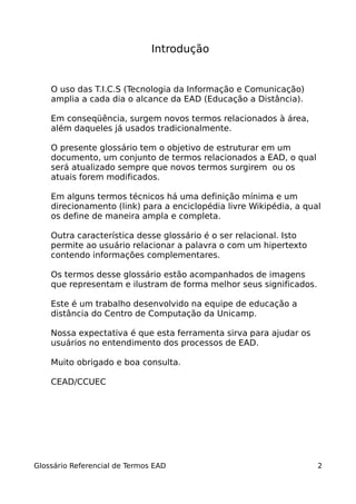 O documento fornece uma introdução a um glossário de termos relacionados à educação a distância (EAD). O glossário tem o objetivo de estruturar esses termos em um documento único e relacional, que será atualizado constantemente. Os termos são acompanhados de imagens para melhor ilustração e compreensão. O glossário foi desenvolvido por uma equipe da Unicamp para auxiliar os usuários na compreensão dos processos de EAD.