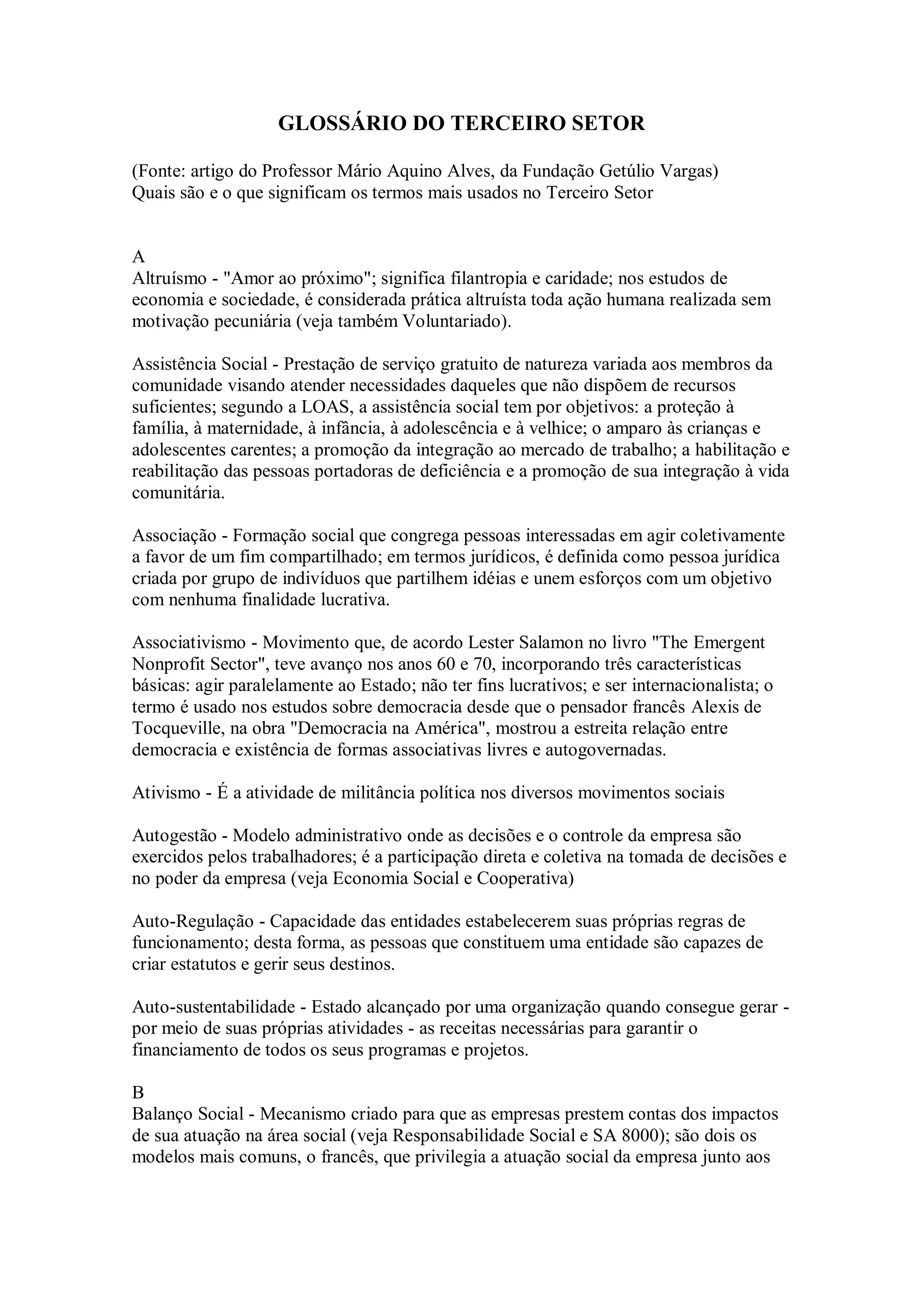 O documento fornece uma lista extensa de termos e conceitos relacionados ao Terceiro Setor, definindo cada um em poucas palavras. Alguns dos termos mais importantes definidos são: Terceiro Setor, como espaço institucional privado e voluntário focado em bens e serviços públicos; Organizações Não Governamentais, como entidades sem fins lucrativos não estatais; e Filantropia, como amor à humanidade relacionado a doações para causas sociais.