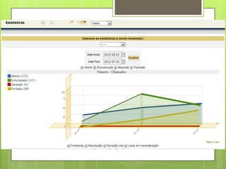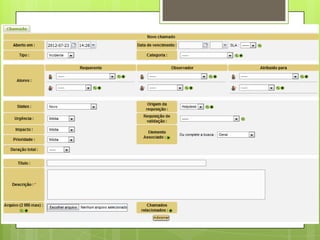 O documento fornece instruções sobre o uso do software de gerenciamento de help desk e ativos de TI chamado GLPI. Explica como acessar o GLPI, abrir e acompanhar chamados, visualizar estatísticas, e criar itens na base de conhecimento.