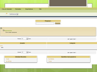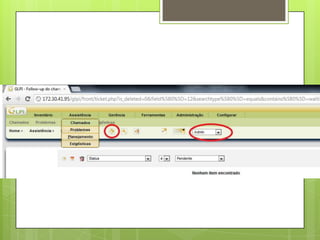 O documento fornece instruções sobre o uso do software de gerenciamento de help desk e ativos de TI chamado GLPI. Explica como acessar o GLPI, abrir e acompanhar chamados, fornecer dicas, visualizar estatísticas e criar itens na base de conhecimento.