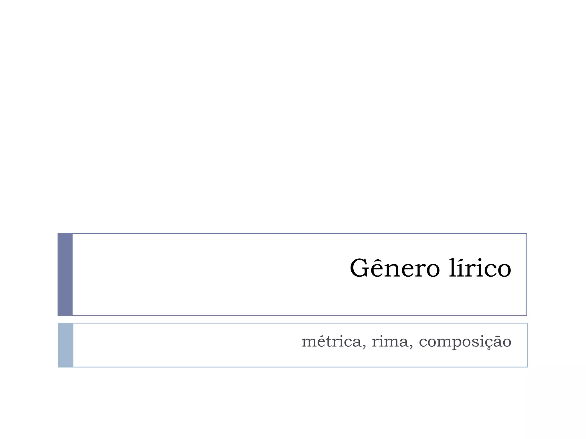 O documento discute características do gênero lírico, incluindo a expressão de sentimentos pessoais do eu lírico, preocupação com a forma poética e predominância da função emotiva. Aborda também conceitos como verso, estrofe, rima, métrica e formas fixas como haicai, soneto e ode.