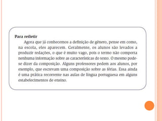 O documento discute gêneros textuais como unidades de ensino-aprendizagem escolar. Explica que os gêneros textuais apresentam características definidas e requerem procedimentos diferentes para serem produzidos. Defende que a língua portuguesa deve ser ensinada a partir dos gêneros textuais, levando em conta suas especificidades.