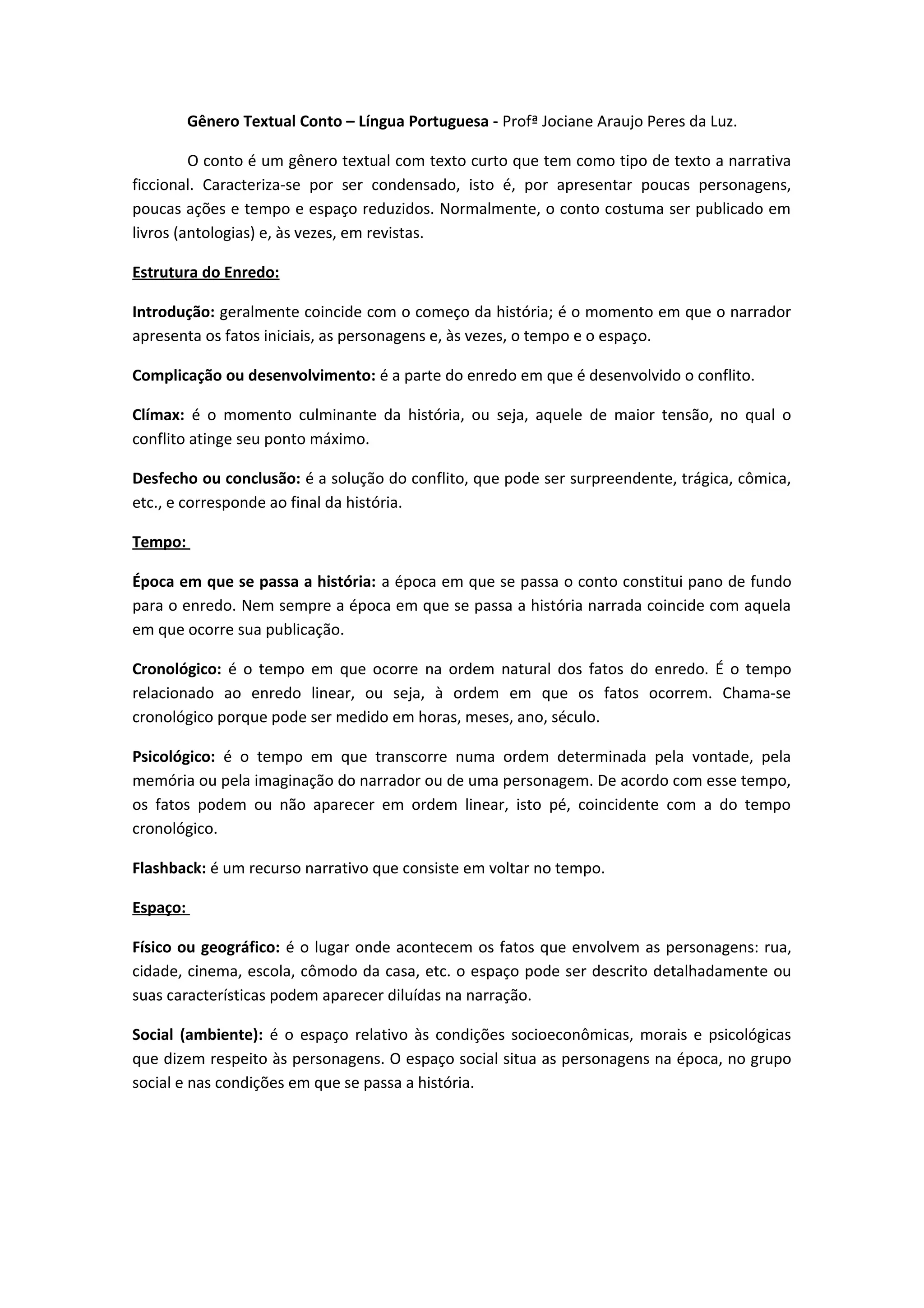O documento resume o gênero textual conto, definindo-o como uma narrativa ficcional curta com poucas personagens e ações em um espaço e tempo reduzidos. Detalha a estrutura comum de um conto, incluindo introdução, complicação, clímax e desfecho. Também discute os elementos de tempo e espaço, distinguindo entre cronológico e psicológico, e físico versus social.