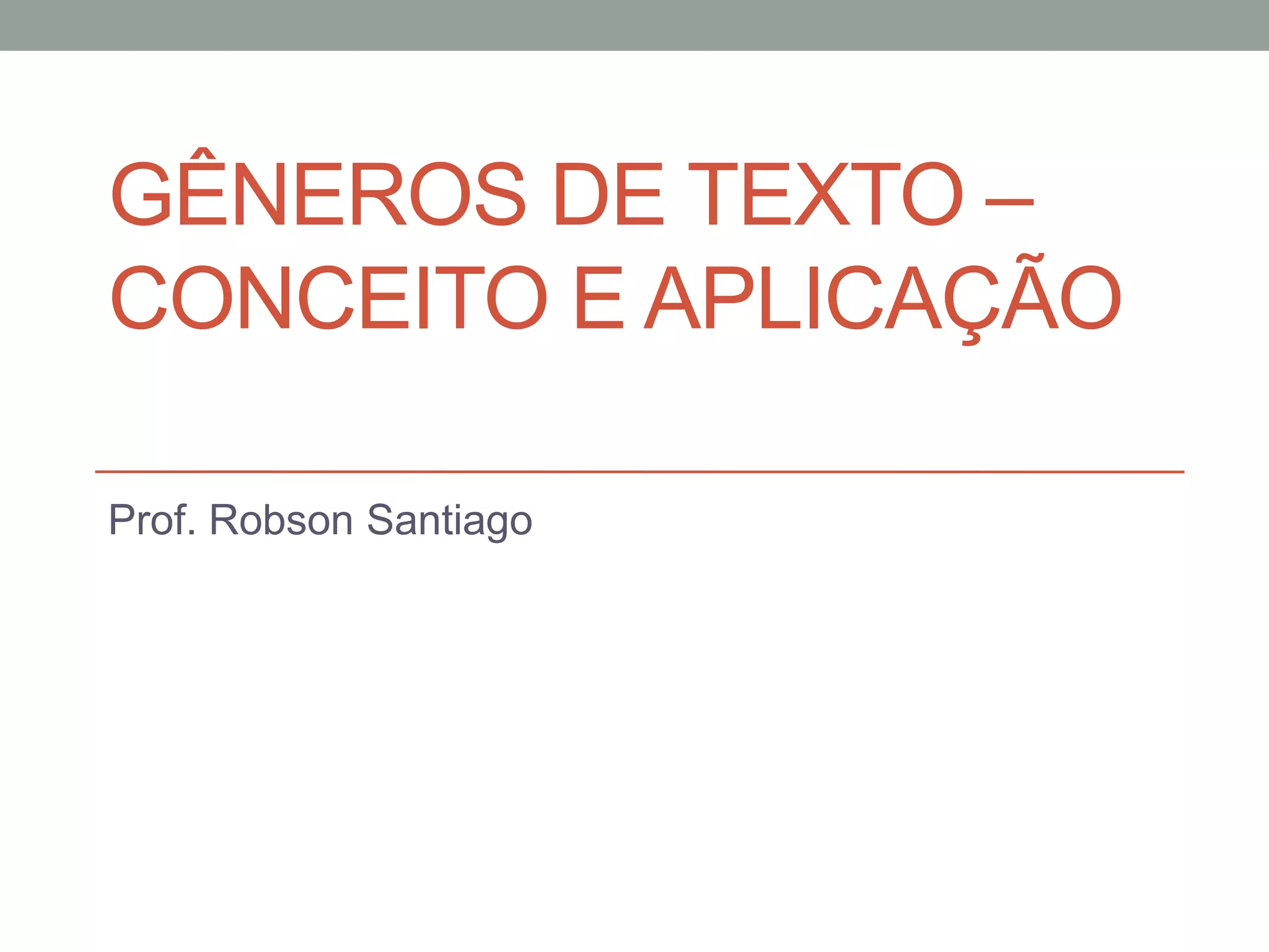 O documento discute os conceitos e aplicações de gêneros textuais. Apresenta os gêneros como reflexos das condições e finalidades de cada campo linguístico, constituídos por tipos textuais como narrativa, argumentação e descrição. Também discute a flexibilidade e hibridização dos gêneros de acordo com fatores históricos, tecnológicos e comunicativos.