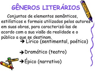 O documento descreve os principais gêneros literários - lírico, dramático e épico. O gênero lírico enfatiza os aspectos subjetivos do autor e predominam emoções. O gênero dramático inclui peças de teatro como tragédia e comédia. O gênero épico envolve narrativas épicas centradas em heróis. O gênero narrativo inclui romances, novelas e contos.