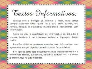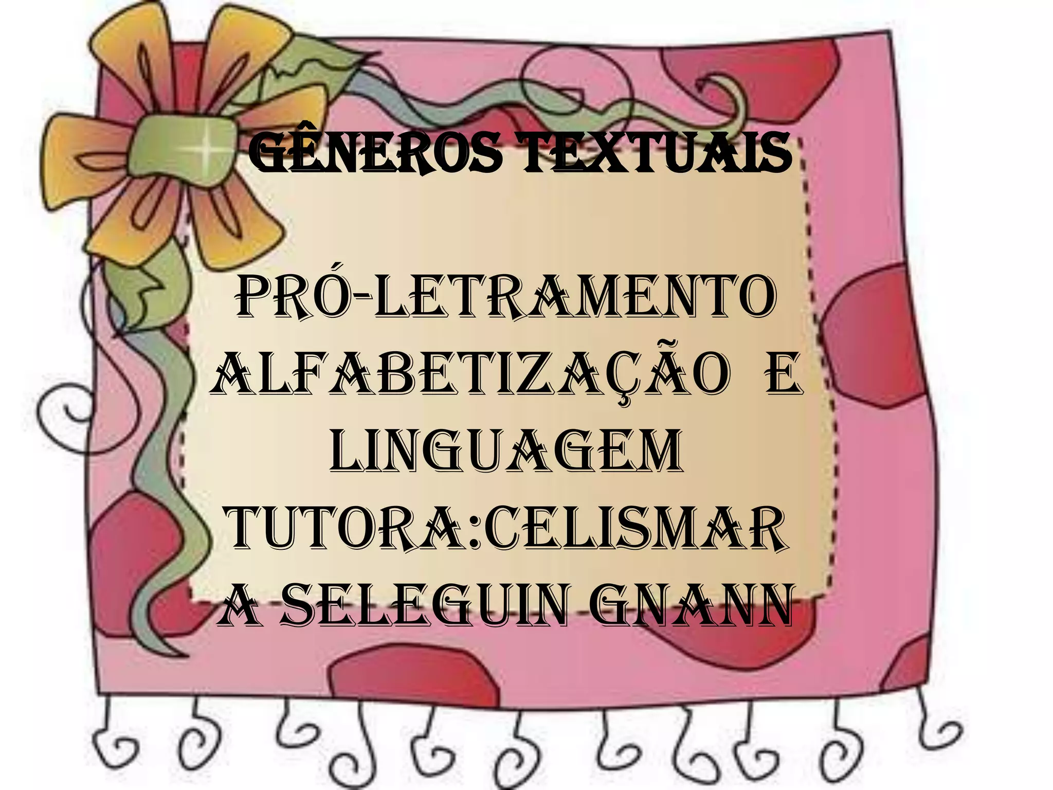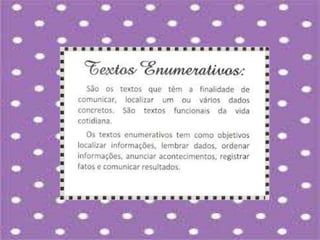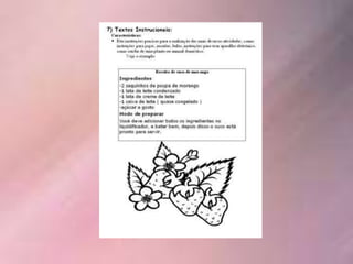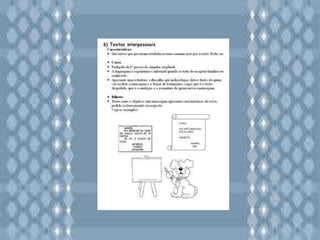 O documento discute a importância de se expor crianças a diferentes gêneros textuais durante o processo de alfabetização. A variedade é necessária para que elas entendam os objetivos e usos distintos de cada texto no dia a dia. A leitura promove a interiorização e reflexão, enquanto a escrita serve para exteriorizar o pensamento. Ambas fazem parte da compreensão do código linguístico.