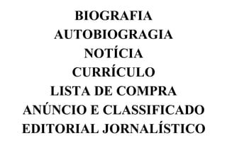 O documento discute gêneros textuais, definindo-os como formas da língua empregada em textos de acordo com sua finalidade de comunicação. Explora características como assunto, emissor, receptor, objetivo e tipo (narrativo, argumentativo, instrucional). Fornece exemplos diversos como biografia, autobiografia, notícia, currículo, lista de compra, anúncio, poesia, carta, tirinha, documentos, entre outros.