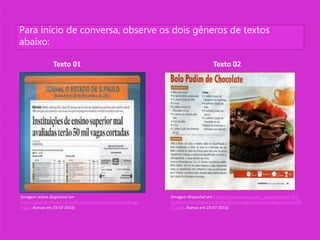 O documento discute gêneros e tipologias textuais, definindo-os como formas relativamente estáveis de enunciados que são produzidos de acordo com a finalidade comunicativa e o contexto. Em seguida, apresenta exemplos de diferentes gêneros como receitas, poemas e conversas telefônicas, explicando suas características e funções sociais.