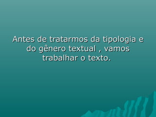 O documento discute tipologia textual e gêneros textuais. Apresenta diferentes tipos textuais como narrativa, descrição, dissertação, injunção e predição. Também lista e descreve vários gêneros textuais como cartas, diários, romances, receitas, instruções de uso e diferentes tipos de comunicação como aulas, debates e e-mails.