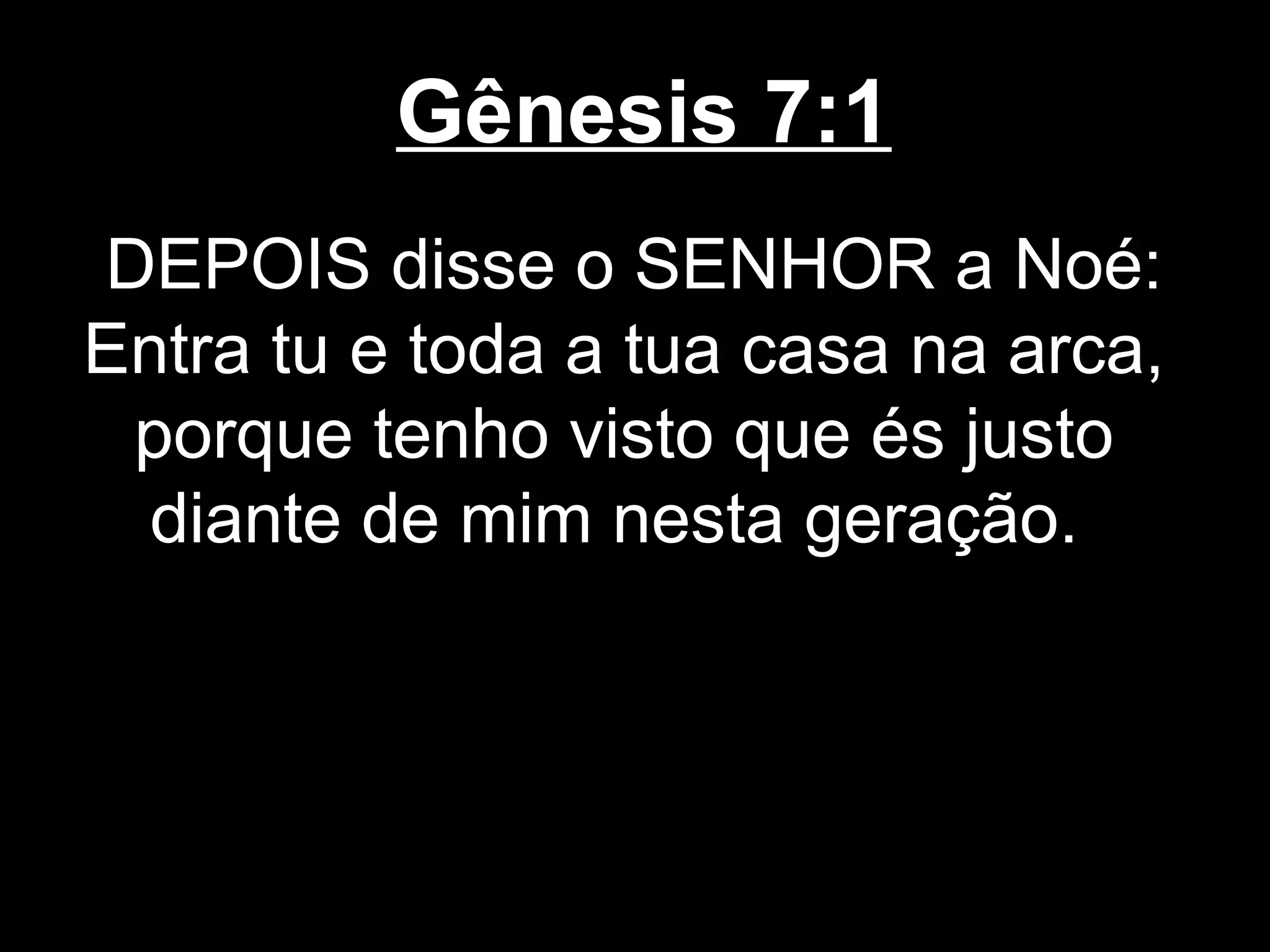 Deus ordena Noé a construir uma arca e trazer animais de cada espécie para salvá-los do dilúvio. Noé obedece as instruções e entra na arca com sua família e os animais. Chove por 40 dias e noites, inundando toda a terra e matando todos os seres vivos, exceto Noé e aqueles que estavam com ele na arca.