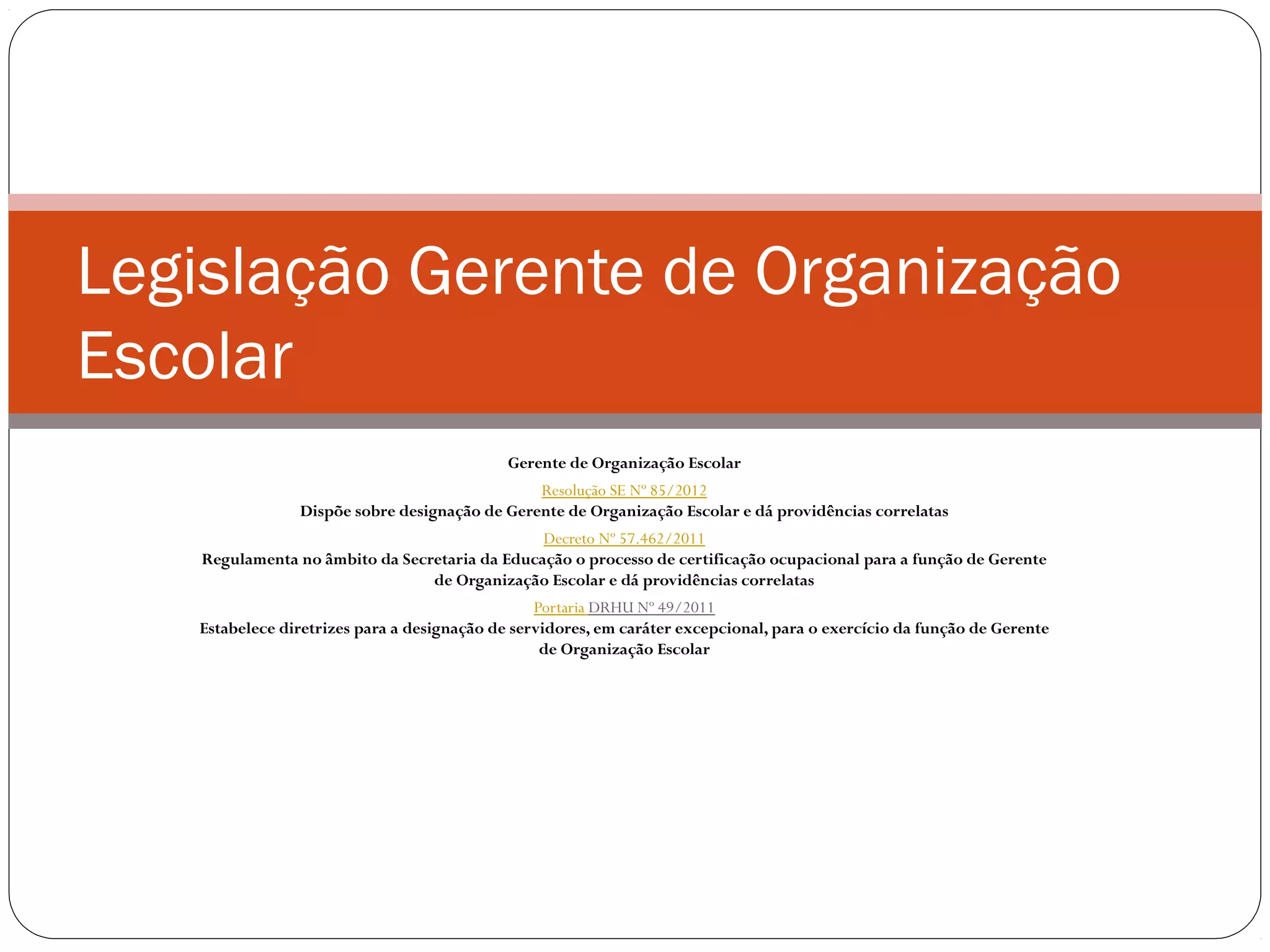 O documento discute a legislação sobre Gerentes de Organização Escolar (GOE) no estado de São Paulo, incluindo decretos que regulamentam a certificação e designação de GOEs, e resoluções que estabelecem suas atribuições e critérios para cessação da designação.