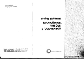 O documento apresenta informações sobre o livro "Manicômios, Prisões e Conventos" de Erving Goffman. O prefácio descreve a pesquisa de campo realizada pelo autor em um hospital psiquiátrico e os desafios de seu método. O livro analisa as "instituições totais", locais que separaram indivíduos da sociedade por um longo período de tempo e formalmente administrados, como hospitais psiquiátricos e prisões.