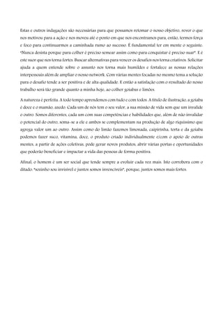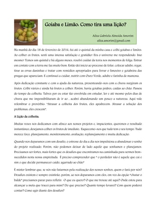 O documento descreve a colheita de frutos (goiabas e limões) no quintal da autora e como isso a fez refletir sobre a importância de não desistir dos projetos, mesmo quando surgem desafios. A autora também discute como trabalhar em equipe pode ajudar a superar obstáculos e gerar melhores resultados do que quando se trabalha sozinho.