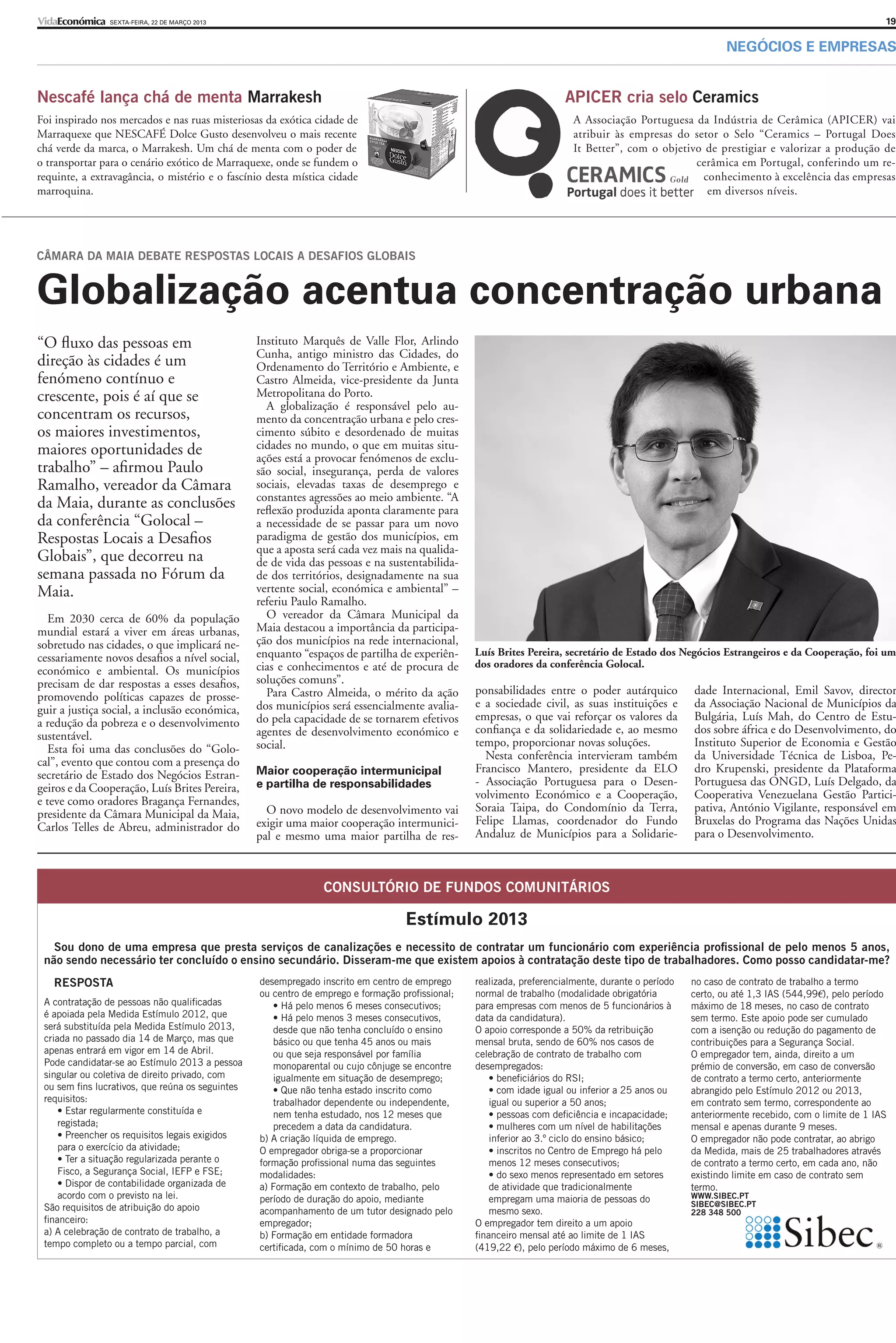 O documento discute três tópicos principais: 1) O lançamento de um novo chá de menta pela Nescafé inspirado na cidade de Marrakesh; 2) A criação de um selo de qualidade pela indústria cerâmica portuguesa; 3) Uma conferência na Câmara da Maia sobre como as cidades podem responder aos desafios globais, como o aumento da urbanização.