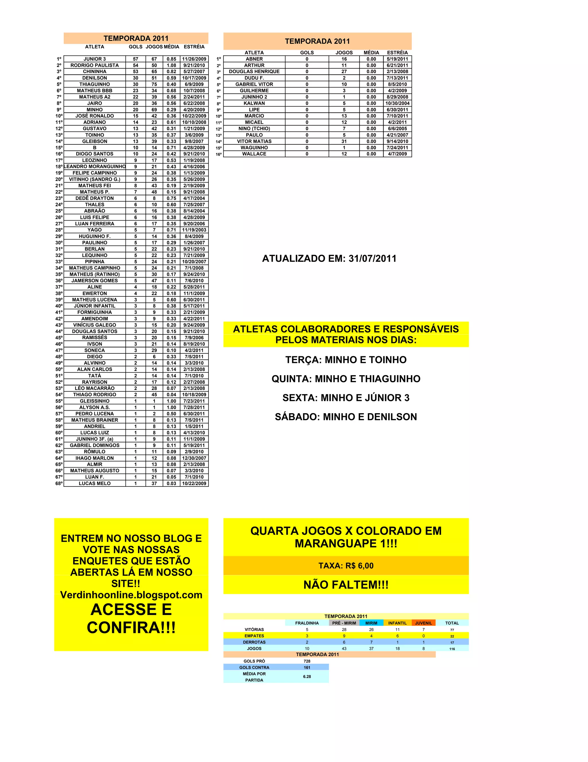 1) O documento apresenta estatísticas de atletas de uma equipe de futebol nas temporadas de 2011, incluindo gols, jogos, média e data de estreia.
