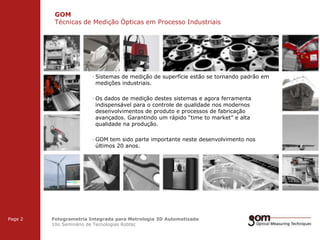 O documento discute o sistema ATOS Plus da GOM, que fornece fotogrametria automatizada para metrologia 3D. ATOS Plus oferece processos de inspeção automatizados, estáveis, repetíveis e confiáveis através da determinação fotogramétrica automática dos pontos de referência. Isso otimiza os fluxos de trabalho, reduz custos e melhora a precisão em comparação com sistemas manuais.