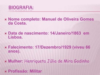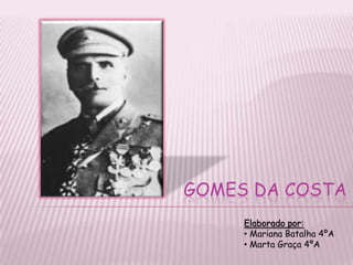 Manuel de Oliveira Gomes da Costa foi um militar e político português que serviu como o décimo presidente da República Portuguesa e o segundo líder da Ditadura Nacional. Ele liderou a revolução de 28 de maio de 1926 que derrubou a Primeira República, mas seu governo durou menos de um mês antes de ser deposto por um golpe liderado pelo general Óscar Carmona em 9 de julho de 1926. Gomes da Costa passou o resto de sua vida no exílio e morreu em condições miseráveis