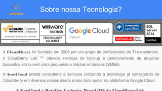 O documento descreve os serviços de backup e armazenamento em nuvem oferecidos pela GooCloud utilizando a tecnologia da CloudBerry. A GooCloud fornece soluções de backup para servidores, desktops, bancos de dados SQL e Exchange, além de máquinas virtuais VMware e Hyper-V, armazenando os backups na nuvem com criptografia e opções de agendamento. A restauração de dados é facilitada através de assistentes ou visualização de arquivos.