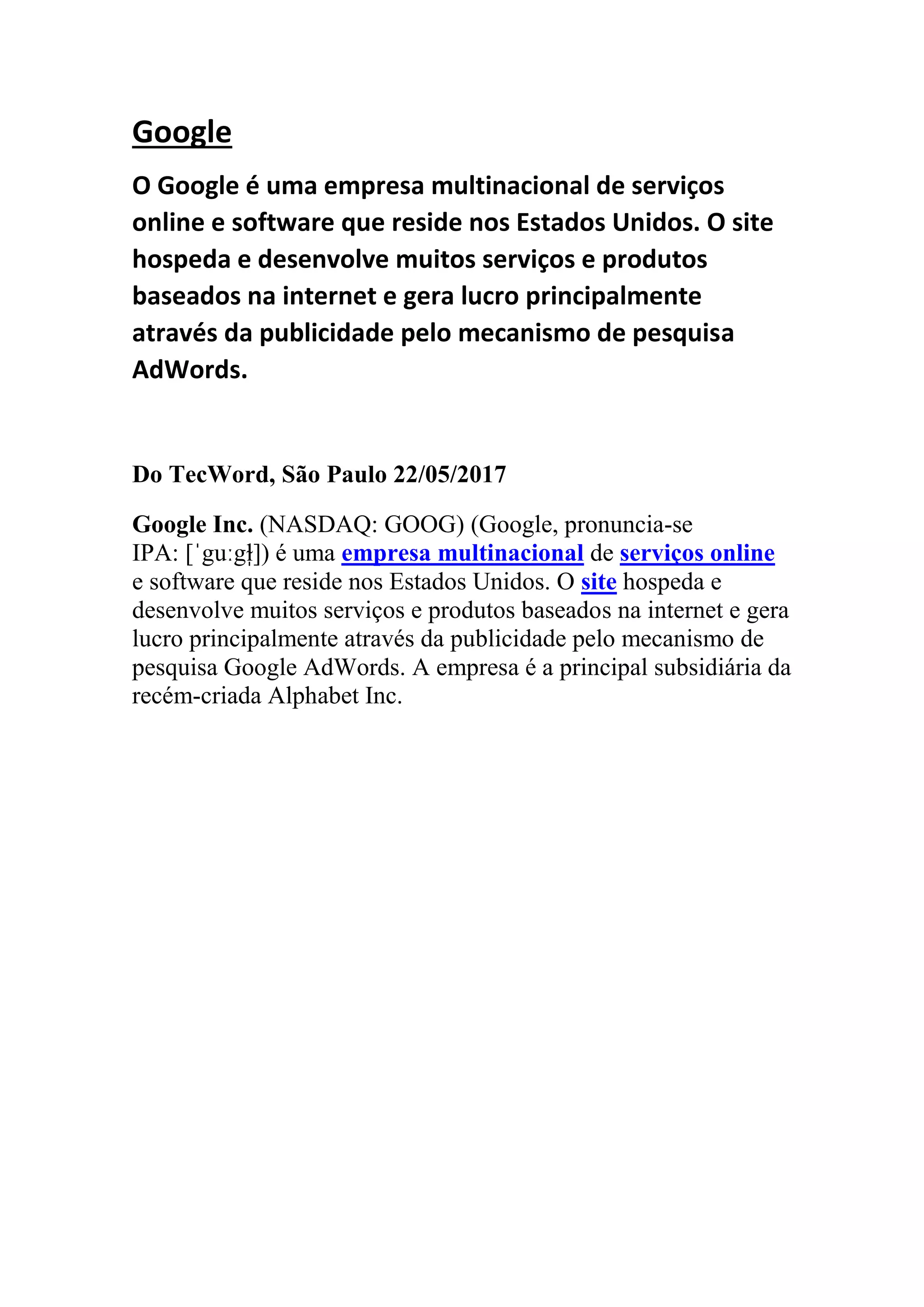 O Google é uma multinacional de serviços online e software, fundada em 1998 por Larry Page e Sergey Brin, cuja missão é organizar a informação mundial. A empresa gera lucro principalmente através da publicidade pelo Google AdWords e oferece uma variedade de produtos, incluindo Gmail e Android. Com sede na Califórnia, é a maior plataforma de busca do mundo e uma das empresas mais valiosas, mas enfrenta críticas relacionadas à privacidade e direitos autorais.