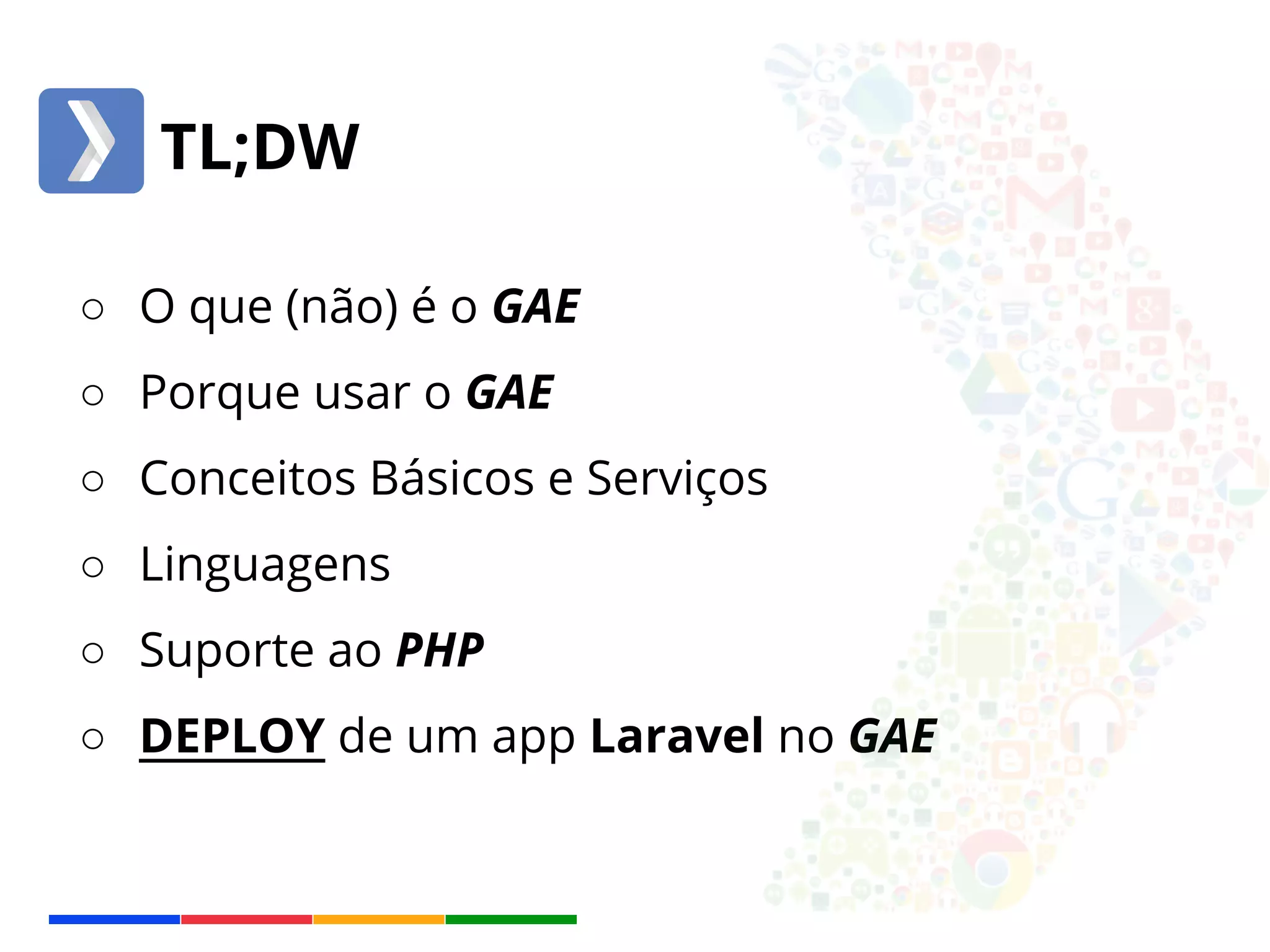 O documento discute o uso do Google App Engine (GAE) para hospedar aplicações PHP, incluindo um exemplo com o framework Laravel. Cobre tópicos como os serviços do GAE, como memcache e banco de dados, e o deploy de uma aplicação de exemplo no GAE usando o SDK do PHP.