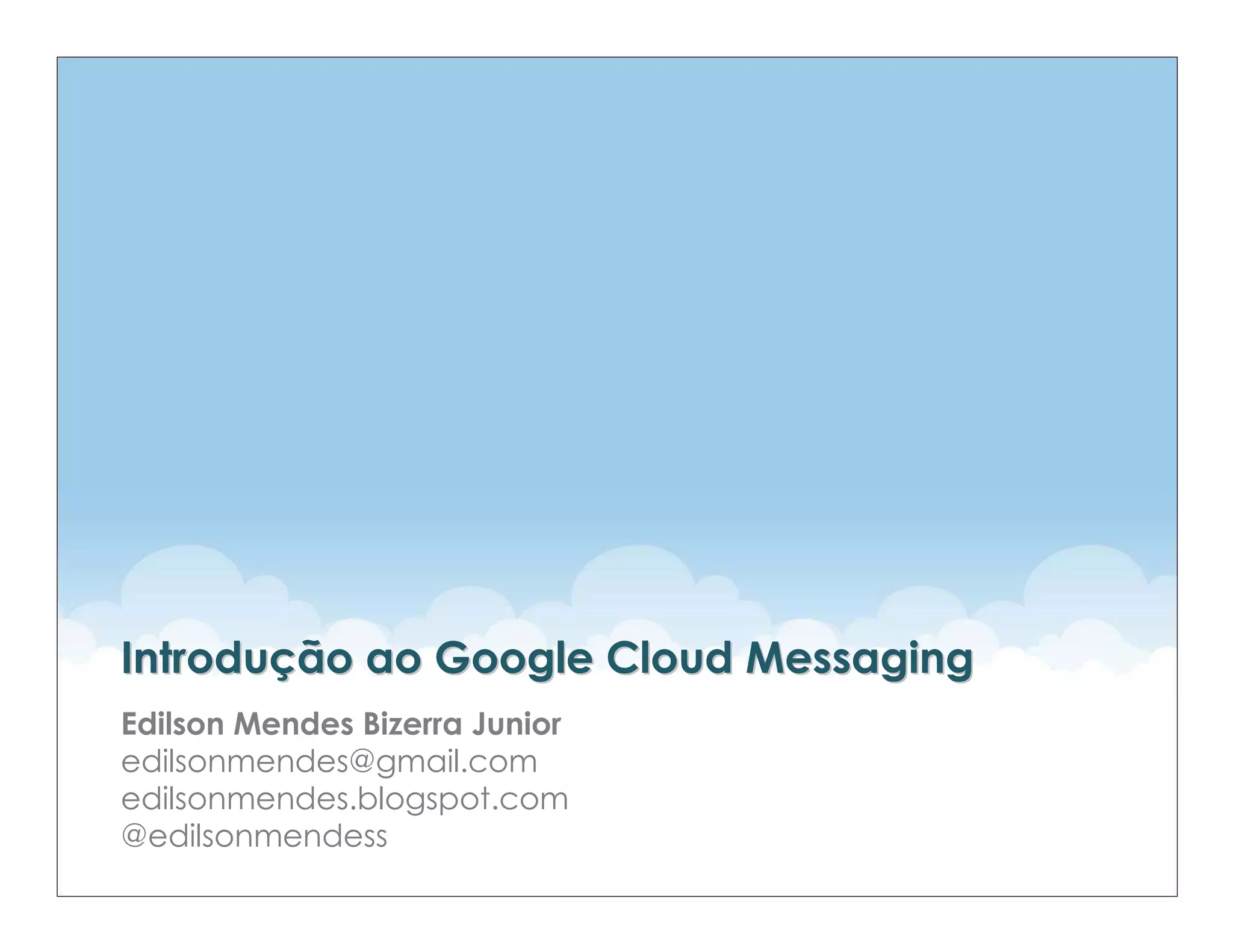 Este documento apresenta uma introdução ao Google Cloud Messaging (GCM), discutindo suas principais características e como ele pode ser usado para implementar notificações por push em aplicativos Android. O documento explica a diferença entre pulling e pushing, como o GCM funciona, como habilitá-lo e integrá-lo em aplicativos cliente e servidor.