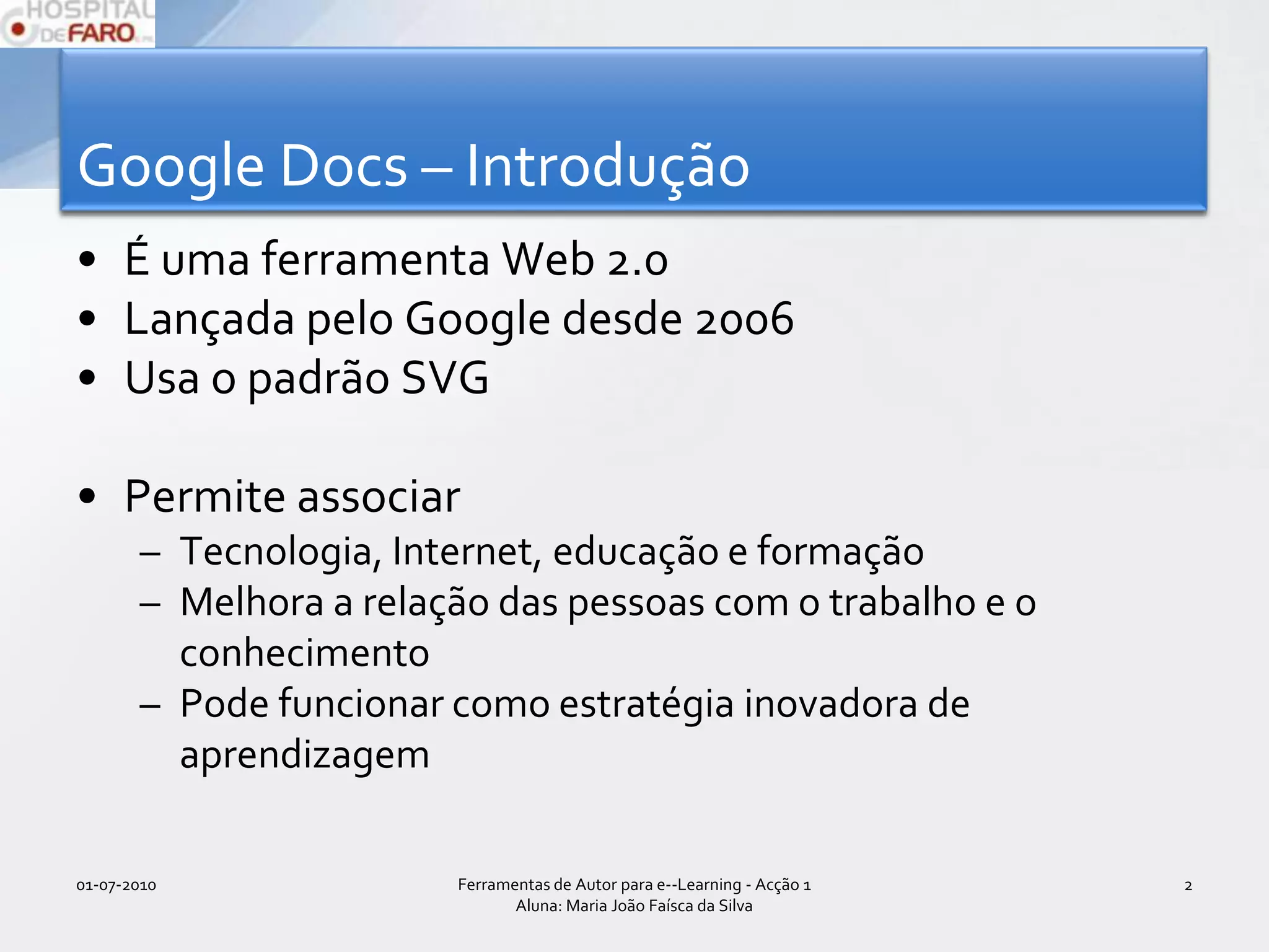 O documento descreve a ferramenta Google Docs, incluindo sua introdução como uma ferramenta Web 2.0 gratuita e online que permite a criação e edição colaborativa de documentos, planilhas e apresentações. Ele também discute como o Google Docs melhorou o desempenho e incentivou a aprendizagem quando usado no ensino e aprendizagem.