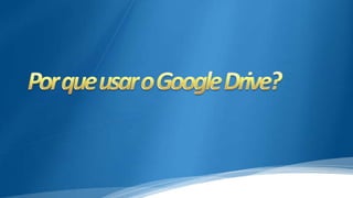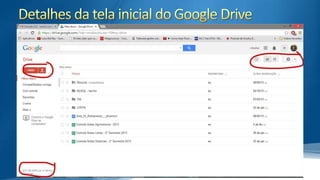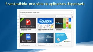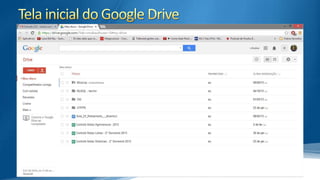 O documento descreve o Google Drive, um serviço de armazenamento em nuvem do Google que permite fazer upload e editar arquivos online. Ele oferece 15GB gratuitos e permite compartilhamento de arquivos com diferentes níveis de permissão. O Google Drive integra-se com outros serviços do Google como Gmail e Google+.