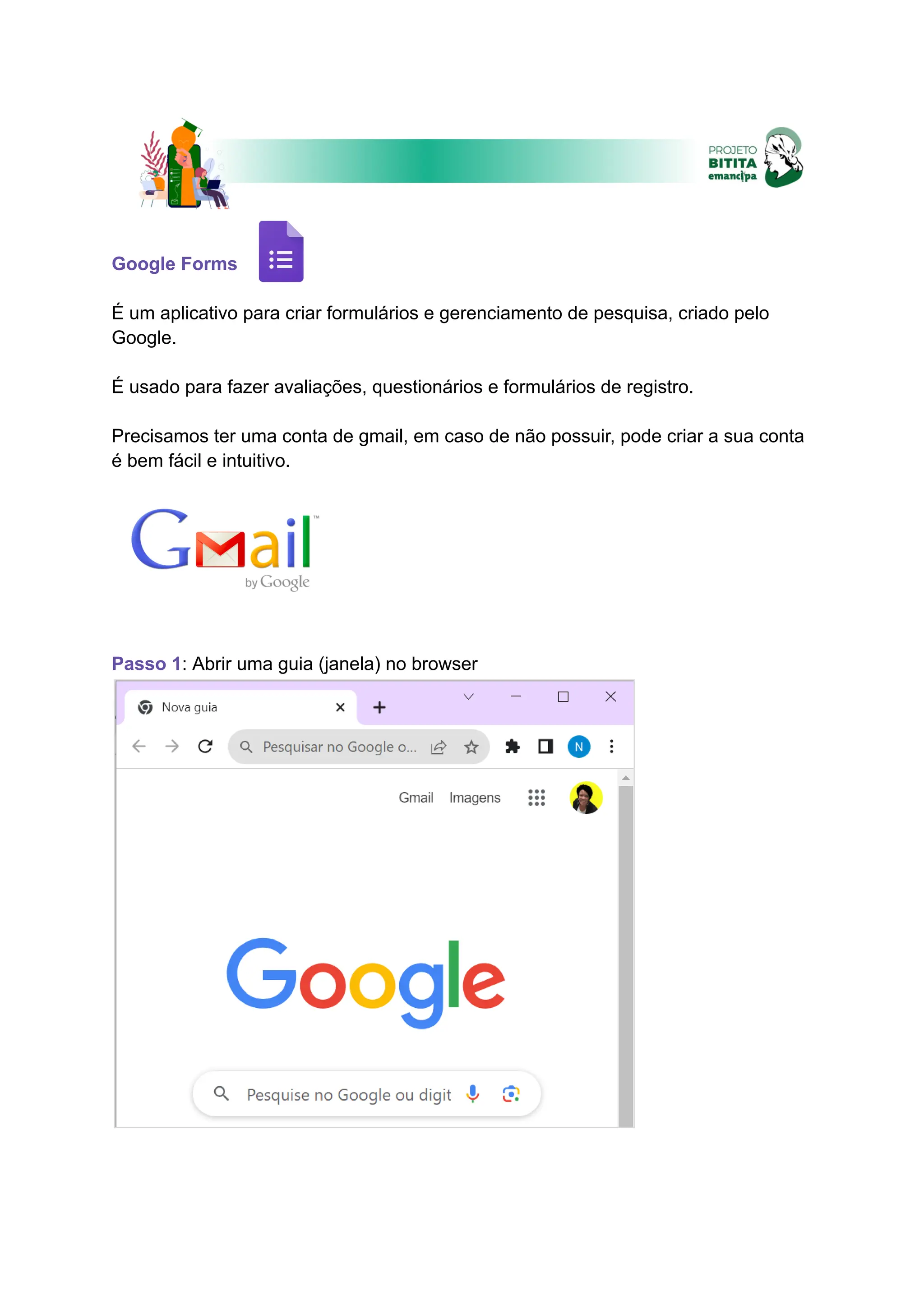 O documento é um guia para criar e gerenciar formulários utilizando o Google Forms, exigindo uma conta Gmail para acesso. Ele detalha passos desde a abertura do aplicativo até a criação de perguntas e configuração de respostas, incluindo exemplos práticos e dicas para elaboração de formulários de avaliação. Além disso, orienta sobre o envio do formulário para os estudantes e fornece informações de contato do autor.