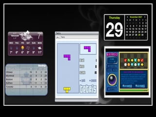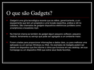 Gadgets são pequenos aplicativos ou ferramentas que podem ser adicionados a ambientes maiores como desktops ou sites para fornecer informações úteis. Os Google Gadgets têm três objetivos: facilitar a navegação, facilitar o uso do computador e possibilitar uma nova forma de anúncio interativo. Um exemplo foi um gadget que permitiu aos fãs da banda Fall Out Boy acompanhar os bastidores de sua turnê e fazer perguntas à banda.