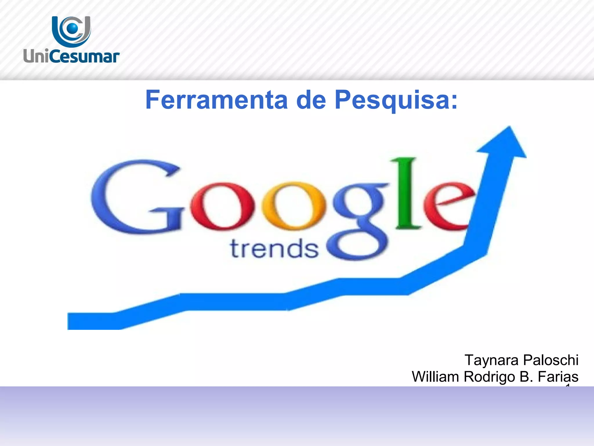 O documento descreve o que é o Google Trends, como ferramenta que mostra termos pesquisados e sua frequência, e suas aplicações, como auxiliar anunciantes a planejar campanhas considerando termos populares e épocas do ano.