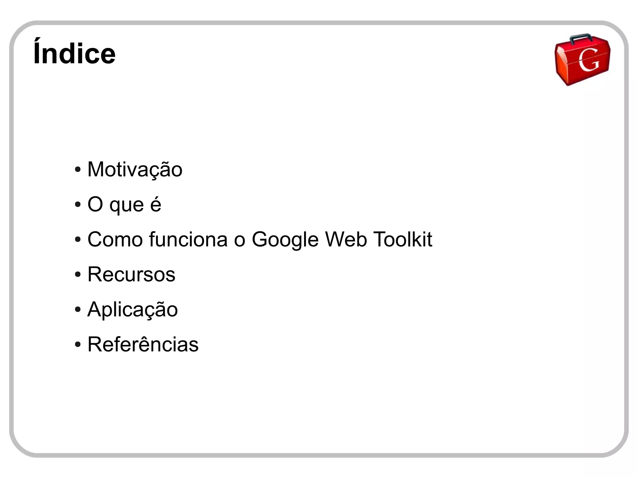 O documento discute o Google Web Toolkit (GWT), que permite aos desenvolvedores criarem aplicativos front-end complexos em Java que são compilados para JavaScript otimizado. O GWT fornece recursos como comunicação com servidores, componentes de interface do usuário reutilizáveis, e integração com ferramentas de desenvolvimento como Eclipse.
